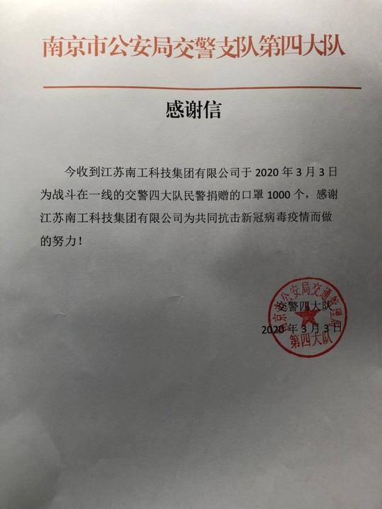 2020年3月3日,执行董事陈俊桦再次代表太阳成集团tyc122cc入口集团,向南京市公安局交警支队第四大队一线民警无偿捐赠了1000枚医用口罩。