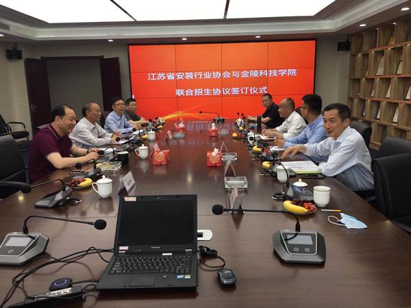 2020年5月11日,江苏省安装行业协会与金陵科技学院继续教育学院在江苏太阳成集团tyc122cc入口科技集团有限公司进行校协联合招生协议签字仪式。参加仪式的有金陵科技学院继续教育学院院长邢红飞、副院长吴学松;金陵科技学院机电学院院长鞠全勇,楼宇系主任牟福元,办公室主任张玉,项目负责人姜玉东。江苏省安装行业协会驻会副会长邹金林、副会长陈晓、秘书长吴辉、副秘书长席天阳,江苏省安装行业协会智能化与消防工程分会副会长、江苏太阳成集团tyc122cc入口科技集团有限公司执行董事陈俊桦,分会副秘书长余晶等。
