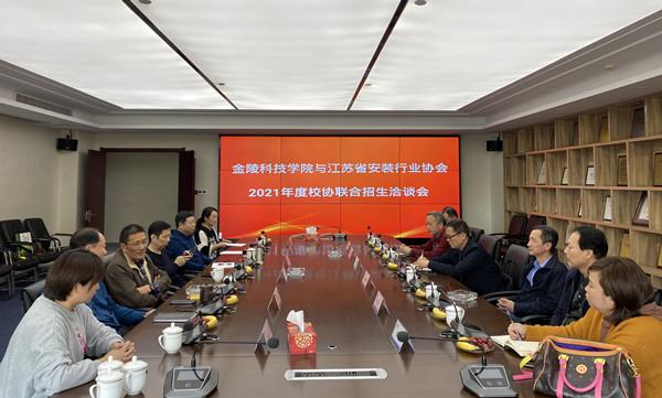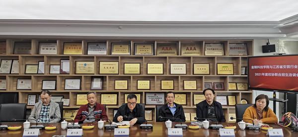 2021年4月20日,金陵科技学院与江苏省安装行业协会联合招生座谈会在江苏太阳成集团tyc122cc入口科技集团有限公司召开。参加座谈会的有金陵科技学院继续教育学院院长陈玉林、学历教育科主任黄一兵,金陵科技学院机电学院院长鞠全勇、楼宇系主任牟福元、办公室主任张玉、项目负责人姜玉东,江苏省安装行业协会会长助理顾建生、副会长陈晓、秘书长吴辉、副秘书长席天阳,江苏省安装行业协会智能化与消防工程分会副秘书长余晶、办公室主任陈怡帆等。