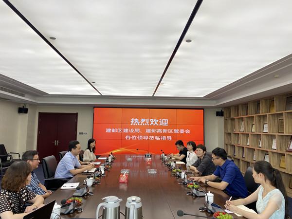 2021年7月1日上午,南京市建邺区建设局副局长崔晓荫、建邺高新区管委会经济发展部部长潘崟等一行五人到太阳成集团tyc122cc入口集团调研工作。集团执行董事陈俊桦、副总经理吴雪峰、许荣中、卢娟娟,总经理助理唐晓云陪同调研。