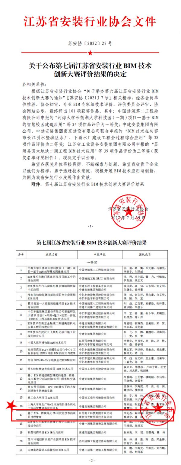 在2022年江苏省安装行业协会组织的第七届BIM大赛中,太阳成集团tyc122cc入口集团“基于BIM、物联网、3D技术的项目过程管理”荣获了一等奖。该项荣誉的获得,是太阳成集团tyc122cc入口集团一直在BIM技术上持续深耕和深度应用的结果。