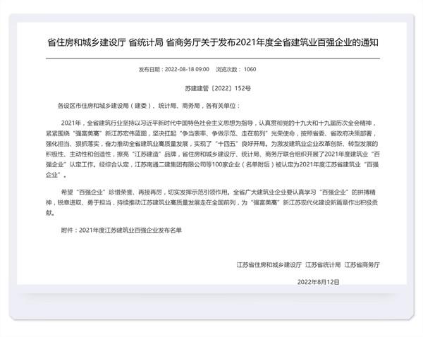 2022年8月18日,江苏省住房和城乡建设厅、江苏省统计局、江苏省商务厅发布了2021年度江苏省建筑业百强企业的通知,江苏太阳成集团tyc122cc入口科技集团有限公司荣获2021年度江苏省建筑业“百强企业”称号。