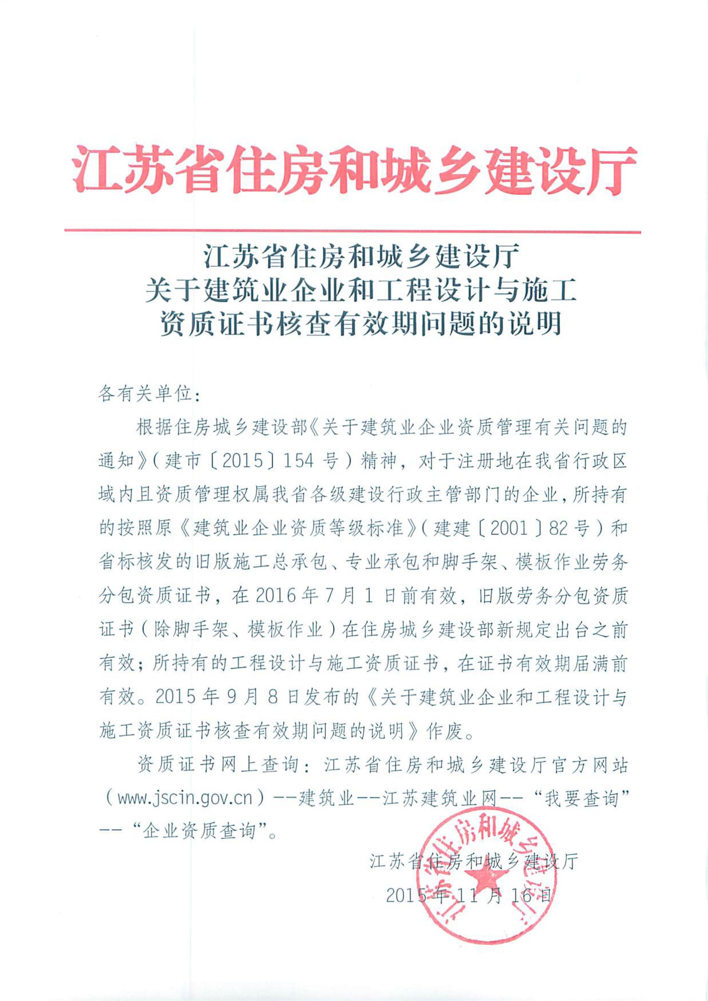 附件:江苏省住房和城乡建设厅关于建筑业企业和工程设计与施工资质证书核查有效期问题的说明